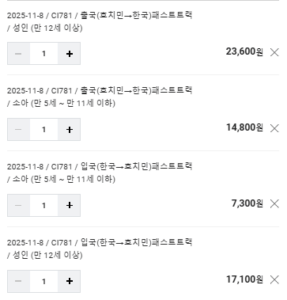 | 입국 (한국 -> 호치민) | 17,100원 | 23,000원 |